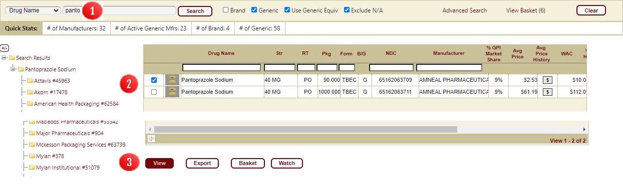 In addition to a customized dashboard you'll find the Drug Info page extremely easy to use. Searching by drug name or NDC lets you quickly view Average Price History, WAC History and State MAC. Drilling down into the details gives you the options to View, Export, add to Basket, as well as add to Watch list.